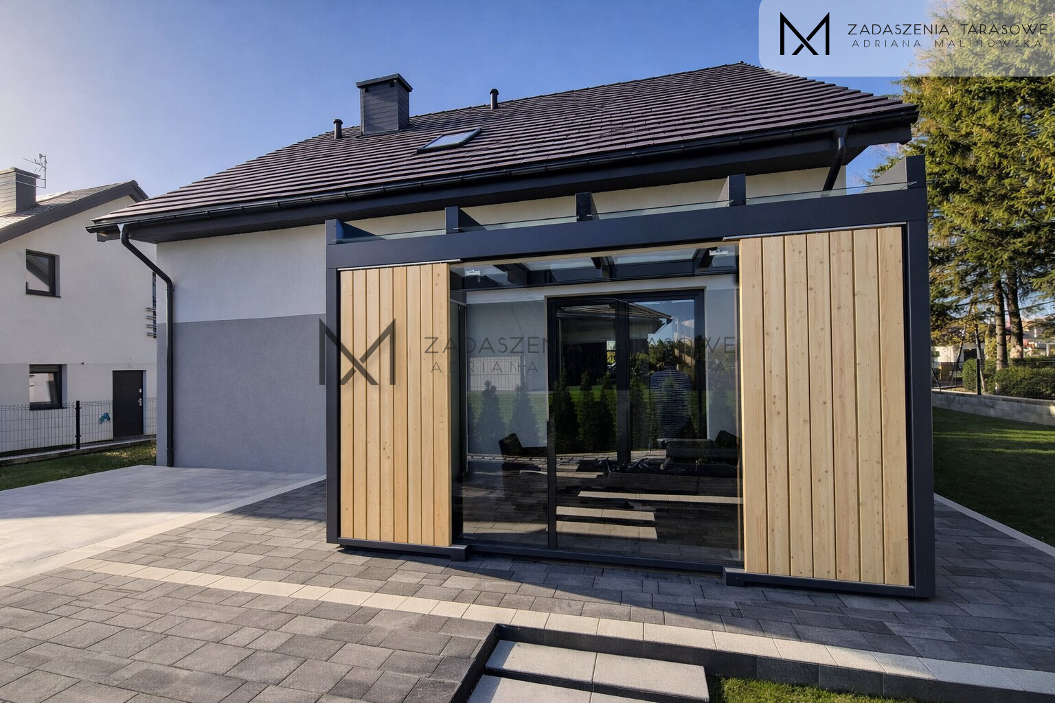 Efekt jest bardzo świadomy. Zadaszenie nie jest ani w pełni nowoczesne, ani klasyczne. Jest dokładnie pomiędzy. I właśnie dlatego przyciąga uwagę.