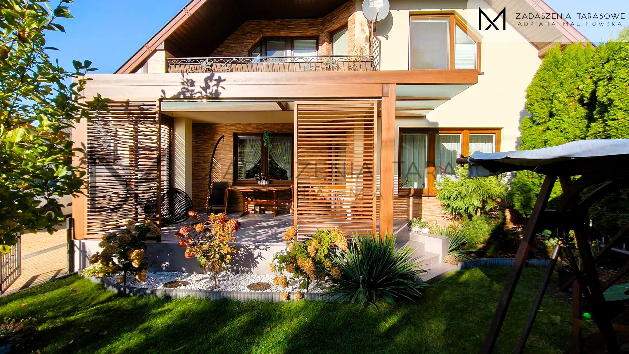 Część konstrukcji wyprowadzono poza prawą stronę tarasu. Dzięki temu możliwe było skuteczne odprowadzenie wody deszczowej poza obszar tarasu. Takie rozwiązanie zwiększa trwałość pergoli oraz chroni taras przed nadmiernym zawilgoceniem.