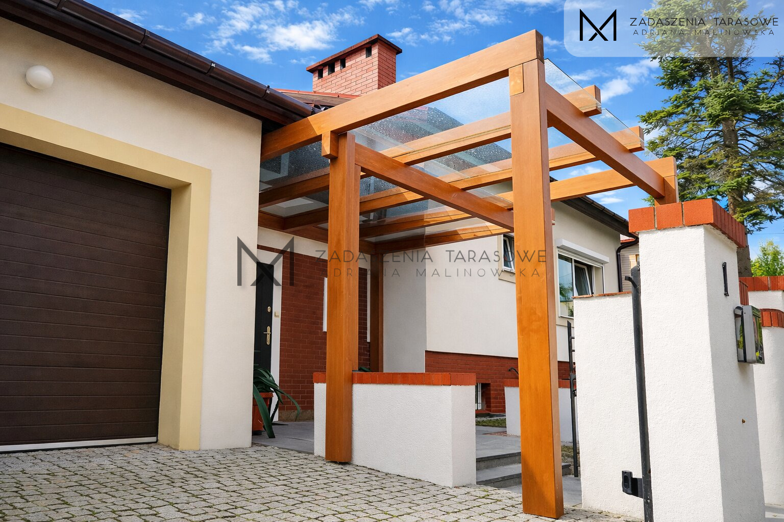Dach wykonany został z transparentnego szkła hartowanego, które w tej realizacji pełni kluczową rolę estetyczną.