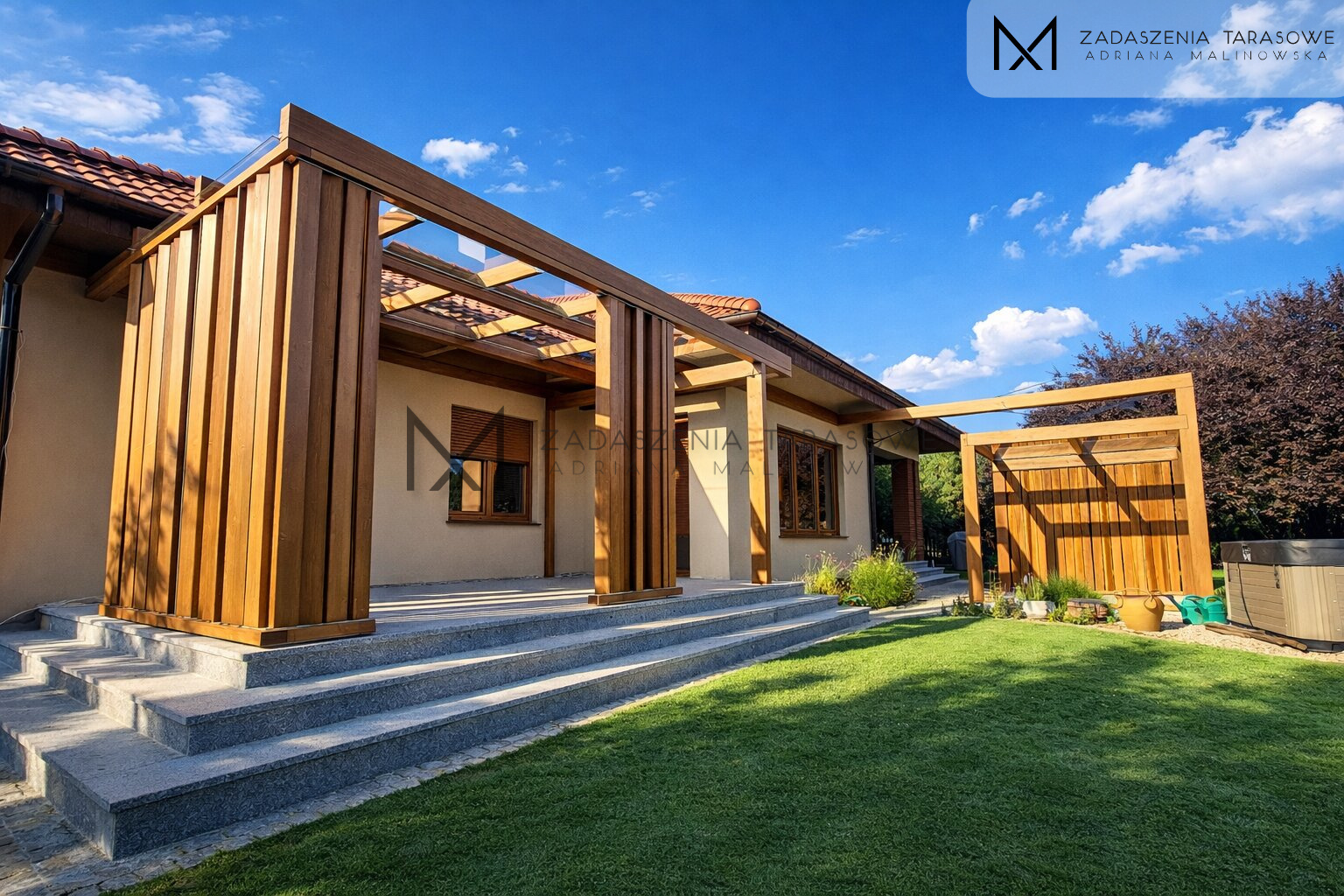 Największym wyróżnikiem tej realizacji jest to, że zadaszenie tarasu i altana na jacuzzi nie są osobnymi konstrukcjami. Zostały połączone wspólną belką opartą na ścianie budynku, co tworzy ciągłość zarówno konstrukcyjną, jak i wizualną.