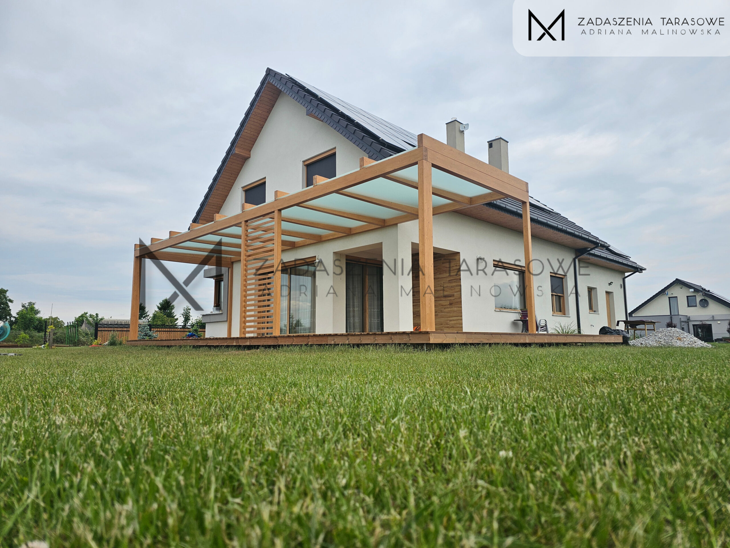 Konstrukcja zadaszenia powstała z drewna klejonego BSH, które cechuje się najwyższą trwałością. Drewno zostało starannie przygotowane i pomalowane w kolorze dębu złocistego. Ten odcień nadaje całości ciepły, naturalny charakter. To właśnie dlatego pasuje idealnie zarówno do nowoczesnej bryły domu, jak i otoczenia ogrodu.