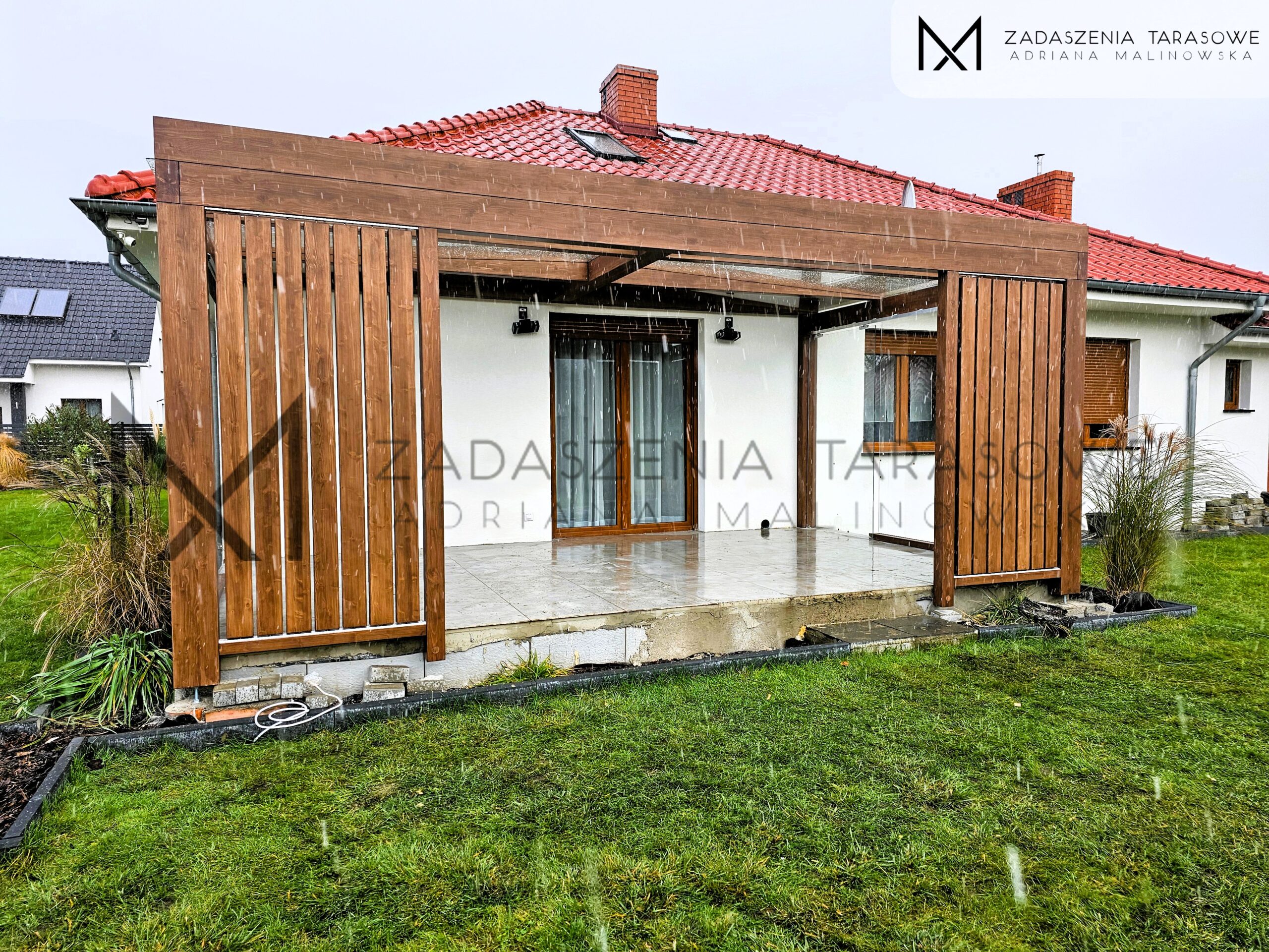 Kolorystyka zadaszenia została dobrana w sposób kontrastujący do stolarki okiennej wykonanej w złotym dębie. Wybór koloru orzechowego podkreśla nowoczesny charakter konstrukcji, a jednocześnie sprawia, że taras staje się wyrazistym elementem całej posesji.