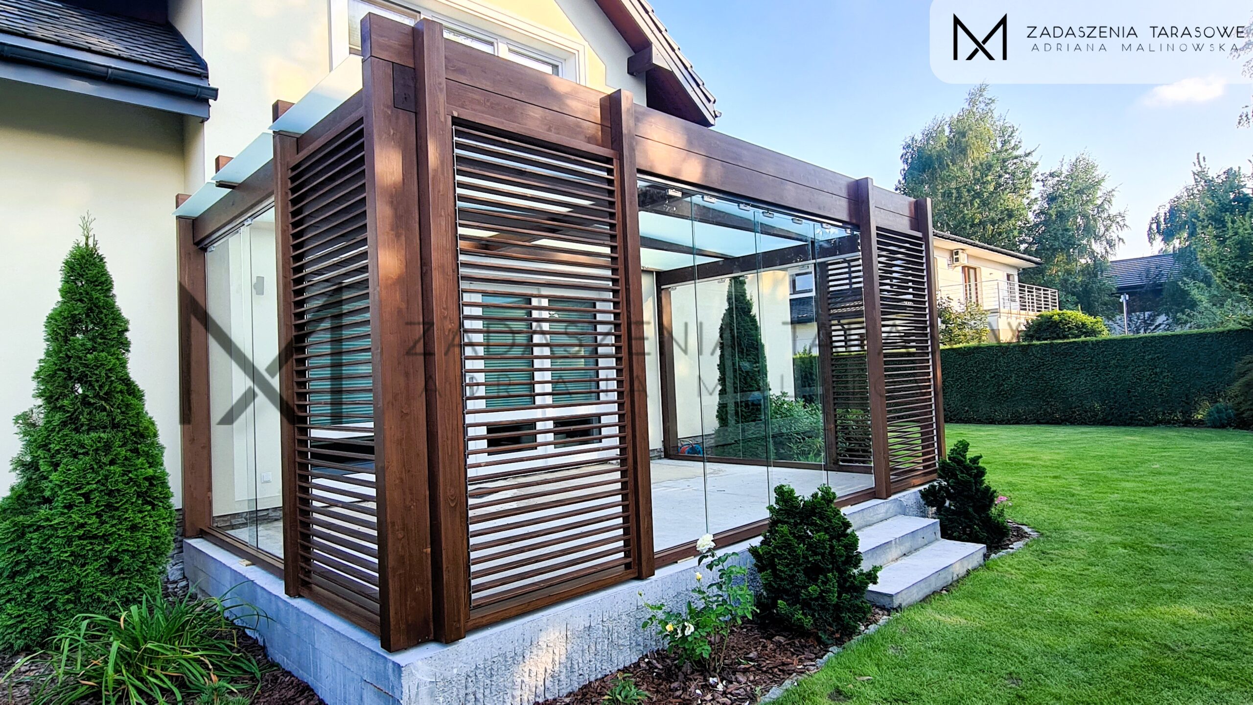 Zadaszenie tarasu nowoczesny design. Zabudowa ścian.