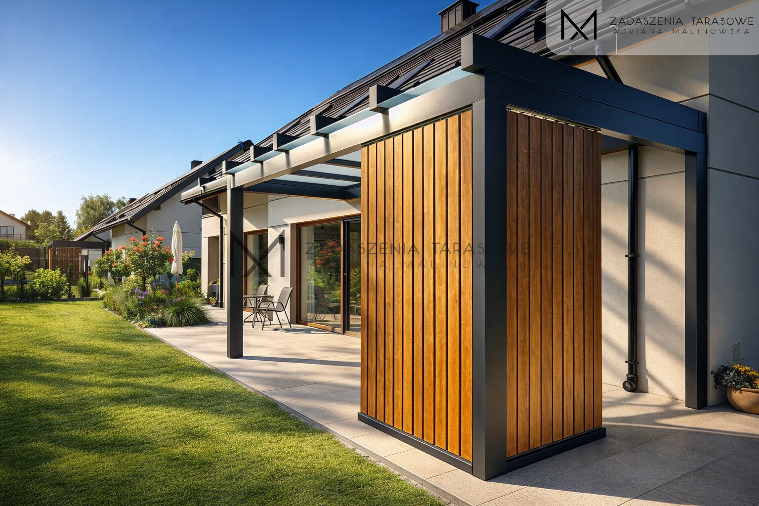 Taras stał się miejscem codziennego odpoczynku, spotkań i relaksu. Chroni przed słońcem, a jednocześnie zapewnia prywatność w newralgicznym miejscu posesji. Co więcej, lamele obrotowe pozwalają dostosować przestrzeń do aktualnych potrzeb.
